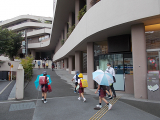 ちょうど子供たちが登校してくる8時ごろ、雨が降っていました。小雨が降ったりやんだりしていたので、傘をさす子供、さしていない子供、それぞれです。校長先生にごあいさつ。「今日は寒いね」と声をかけています。