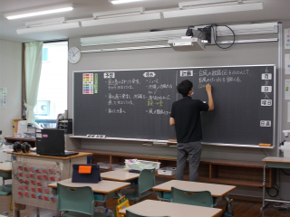 国語。「つなぎことばのはたらきを知ろう」。つなぎ言葉の使い方を知り文章をつくっていきます。ノートに書いたり、発表したり。つなぎ言葉ってとても大切です。その言葉によって、次の文章が予想できるのですから。