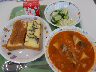 今日のメニューは、チキンピラフ、グリーンサラダ、コーンと豆のポタージュです。