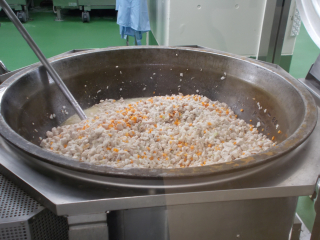 今日のメニューは、たきこみごはんとぎせい豆腐、沢煮碗です。