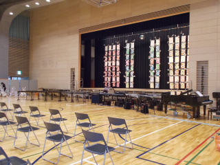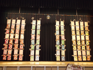 音楽会2日目 保護者鑑賞日 2021年11月20日 09時01分 よく晴れたきれいな青空の朝です。朝方まで大きな満月が出ていました。今日は音楽会です。2日目保護者鑑賞日です。 続きを読む 6年生作の楽器のオブジェには、ライトも光りさらにパワーアップ。ウェルカムボードも6年生作です。大きなベニヤ板を電動糸のこぎりで切り、文字を釘で打ってから糸をかけた糸掛けアートです。必見です。階段や廊下にあたたかく光るのは、5年生による和紙のランプです。素材の違う和紙を組み合わせてビーズや毛糸で装飾しました。朝、5年生の子供たちがライトを中に入れて飾りました。幻想的な光を放つ道で、訪れた方々を見送ります。壁面の絵画は5年生作です。SDGsの取組として、未来に残したい美しい街並みへの思いを込めて描きました。音楽会の守護神ミラーボールに融合するアルミ箔のボードには、1年生から6年生まで子どもたちの手形。それぞれの学園の手の大きさが6年間の体の成長を感じさせます。手形アートに添えられているのは、5・6年生によるアルミ缶からつくったたくさんの花たちです。世にも不思議な花を咲かせました。メタルカラーの世界をお楽しみください。会場に来ていただける方は、この場所で。来ることができない方は、オンラインでお待ちしています。 閉じる