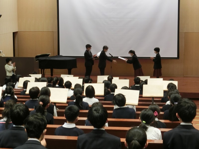 修了証授与 各学年の代表者が受け取ります。呼名をされたら「はい」としっかりこたえて壇上にあがります。